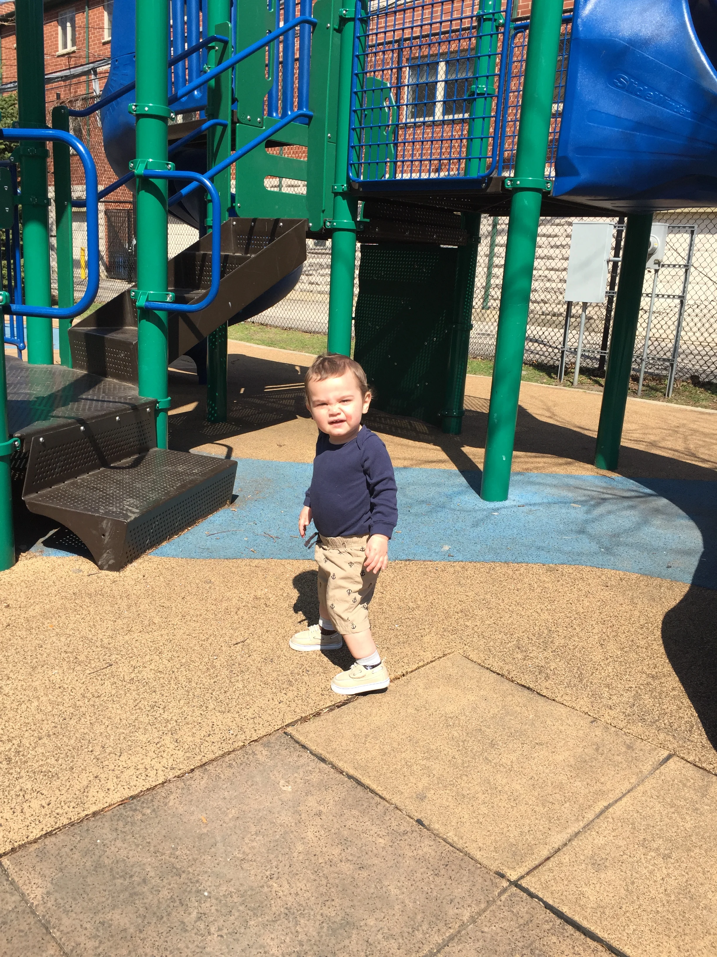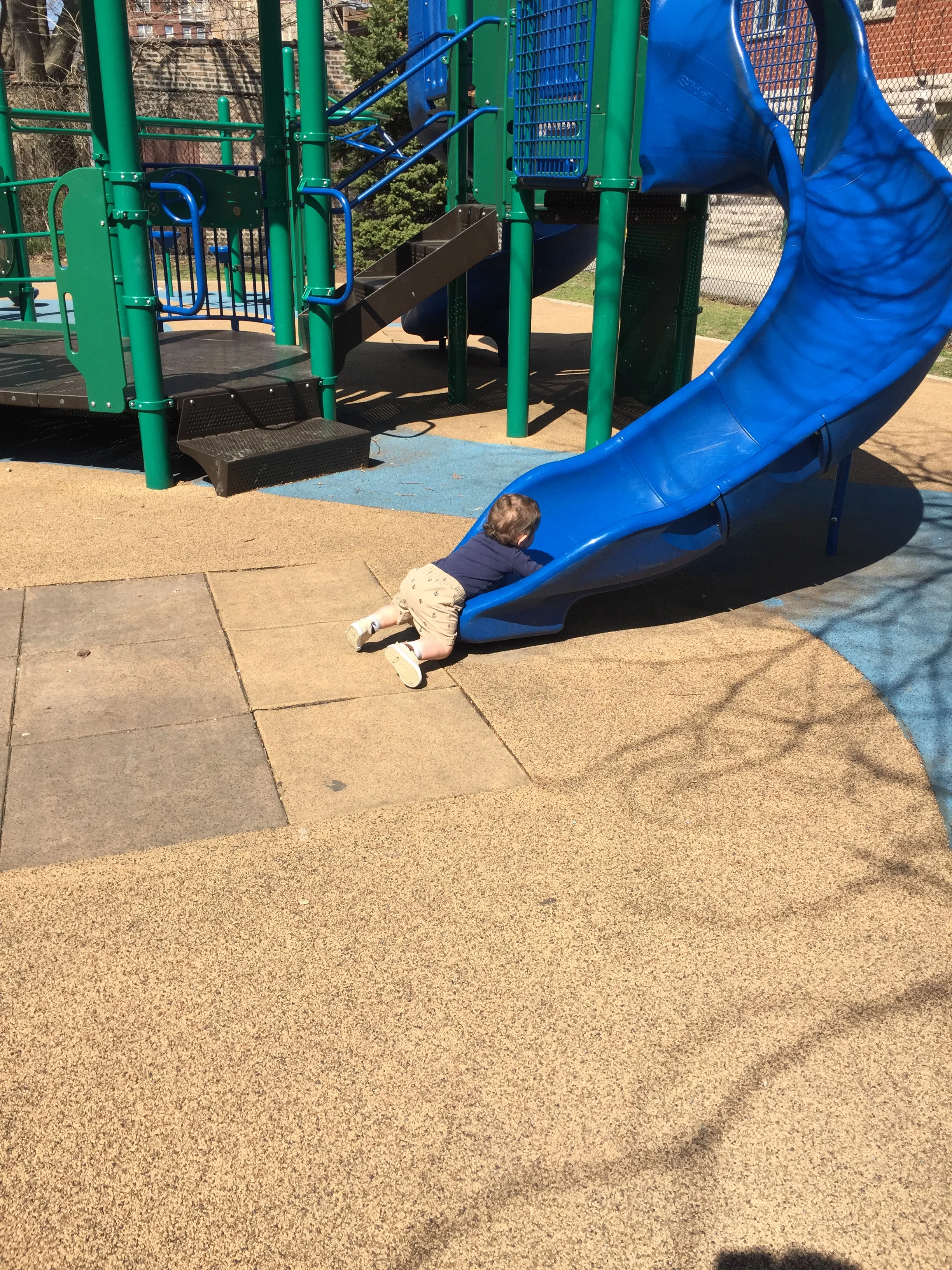 Elias and I headed out on a hot day -and he got to wear shorts for the first time in Chicago. He went on the slide, and later got his first booboo!